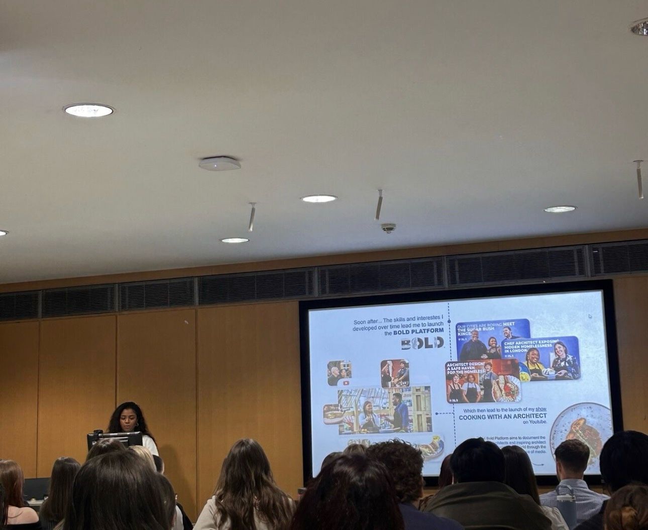Joining a panel alongside Chris Williamson, RIBA President, and Mark Lineton, Associate Partner at Fosters + Partners, she spoke about her career journey after graduating, from developing her graphic design skills and building her BOLD Platform, to creating the show Cooking with an Architect, and now returning to the architecture industry. She shared honest insights into how she got to where she is today and the realities of entering the architectural profession.