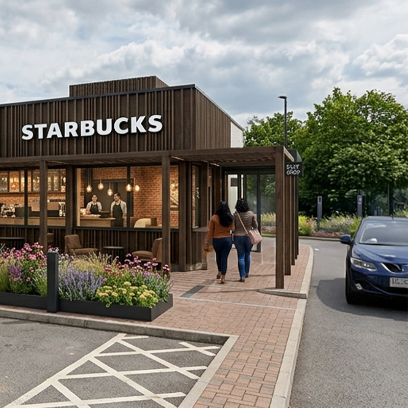 “Delivered alongside Tesla’s largest UK charging hub and showroom, Starbucks Trafford will be their first self-developed Drive-Thru prototype, targeting the Passive House Standard.”